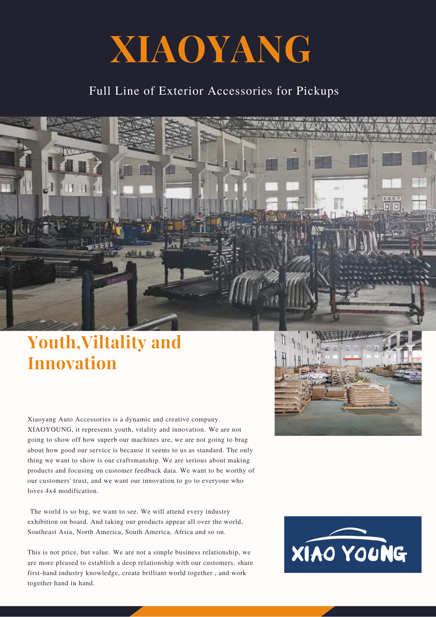Xiaoyang Auto Accessories is a dynamic and creative company. XiaoYoung, it represents that to create Xanadu with ambition, innovation, Outstanding, and youth.